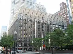 Designed by Frederick J. Osterling, the building was constructed on the site of Pittsburgh's nineteenth century St. Paul's Catholic Cathedral.[4][5] It is not known to have been modeled after any particular building, but Brussels Town Hall, Leuven Town Hall (both Brabantine Gothic) and the then-new Woolworth Building have been suggested as influences.[6] The design has also been partially attributed to Pierre A. Liesch (1872–1954), who worked with Osterling on the project. Liesch was a native of Luxembourg and later used a similar Flemish Gothic style for his design of the Croatian Fraternal Union Building.[7]