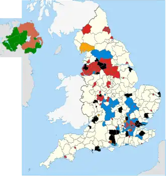 ![]() Map showing results of English and Northern Irish local elections, 2014. Council control in England and in Northern Ireland the largest parties are shown (where all councils had no overall control). Black represents No Overall Control, white represents areas that did not hold an election, blue represents the Conservative Party, red represents the Labour Party and gold represents the Liberal Democrats. Areas in light red represent the Democratic Unionist Party. Dark green represents Sinn Féin and light green represents the SDLP. Areas shown in grey are outside England and Northern Ireland | |||||||||||||||||||||||||||||||||||||||||||||||||||||||||||||||||||||||