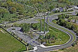 The three memorial spires range from 201 feet (61 m) to 270 feet (82 m) high and appear to be soaring; its array of stainless steel arcs against the sky evokes the image of "contrails of the Air Force Thunderbirds as they peel back in a precision 'bomb burst' maneuver." Only three of the four contrails are depicted, at 120 degrees from each other, as the absent fourth suggests the missing man formation traditionally used at Air Force funeral flyovers.[5]