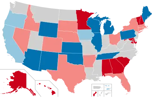 Overall, despite the gains that they made at the federal level – an unprecedented feat in a midterm election – the Republicans suffered a net loss of one seat in this gubernatorial election cycle, while the Democrats made a net gain of three. The Republicans managed to maintain their majority of state governorships, but it was reduced to a margin of only two seats. The elections were notable for the sheer number of state governorships that changed parties – 20 in total, constituting more than half of the seats up for election. Additionally, a number of Democratic and Republican gains occurred in states that typically favor the other party. For instance, Republican candidates won the usually Democratic states of Maryland, Hawaii, Minnesota, and Vermont; while Democratic governors were elected in Republican-leaning states like Wyoming, Tennessee, Oklahoma, and Kansas.