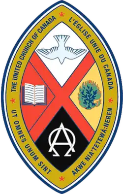 In 2012, the 41st General Council elected Gary Paterson as the first openly gay Moderator.[32] The commissioners also voted to invite First Nations peoples to become signatories to the Basis of Union. (In 1925, several aboriginal congregations of the original founding churches were automatically made part of the new United Church although the congregations had not been asked to participate in church Union negotiations, and had not been asked to sign the Basis of Union document.) In addition, the original church crest (adopted in 1944 with French added in 1980) was modified by changing the background colours of the four quadrants of the crest, as well as adding the Mohawk phrase "Akwe Nia'Tetewá:neren" ("All my relations") to the crest's perimeter.[20]