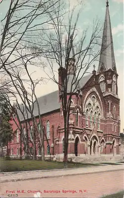 Originally constructed for the Methodist church to host their annual regional meeting, the Hall has hosted politicians and activists including William Jennings Bryan, Henry Ward Beecher, Frederick Douglass, Senator Edgar T. Brackett and President William Howard Taft. In 1976 the Methodists sold the building to the Universal Baptist Church, who used it until the building’s deteriorating state made it unsafe; in 2000, the building was condemned.[2] In 1999, citizens of Saratoga Springs joined with members of the Baptist Church to rescue the Hall from collapse. They formed a partnership to rebuild it as a performance and events center, while creating a separate worship space for the Baptists within the building. The new sanctuary for the Baptist Church was completed in 2004 and services are held there every Sunday.