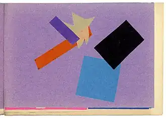 In the preface Kruchenykh claimed that the collages were born of the same source as transrational language- 'the liberation of creation from unnecessary conveniences (through non-objectiveness)'.[16] He cited the style as originating with Rozanova, and taken up by Malevich under 'the rather uninformative name' of Suprematism. In fact, the Russian avant-garde were well aware of Kandinsky's experiments with Abstract art. Kandinsky, a Russian living in Munich, regularly returned to Russia, and had contributed to A Slap In The Face Of Public Taste with a poem from Klänge, an artist's book of sound poetry placed in tandem with abstract woodcuts, published in Munich, 1912. Another seminal artist's book, La prose du Transsibérien et de la Petite Jehanne de France by Blaise Cendrars and another Russian, Sonia Delaunay, had been exhibited in Russia in late 1913, and similarly linked colourful abstract images with concrete poetry.