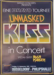 The Unmasked Tour was the first time that Kiss only played in Europe, Australia,[2] and New Zealand, with only one show played in the United States, at the Palladium Theatre in New York.[3] "Cold Gin" returned to the set for the first time since the Rock & Roll Over Tour, and featured Ace Frehley on co-lead vocals, rather than solely Simmons, who had sung the song on all previous tours on which it was performed. "You're All That I Want" was performed briefly, but was quickly dropped. "Strutter", which had not been performed live since the Destroyer Tour, returned to the set as well. Iron Maiden were the opening act for the European leg of the tour.[4][5] English heavy rock band Girl supported Kiss at Stafford, Bingley Hall. During an autograph session from the band while on tour in West Germany, more than 2,000 fans in Frankfurt ended up causing severe traffic jams. The West Germany concerts would bring in a total of 100,000 fans.[6] The stage show and costumes, with the exception of Carr and Stanley, were holdovers from the Dynasty Tour.
