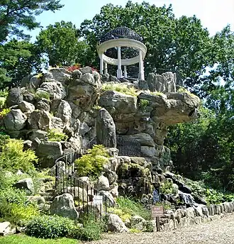 The Temple of Love is a cantilevered rocky fantasy designed by a Genoese stone mason Carlo Davite, with a round temple folly on top. In Untermyer's time it was surrounded by an extensive rock garden with terraced beds. Many of the rocks are hollowed out in order to be used as planters.[30][26]