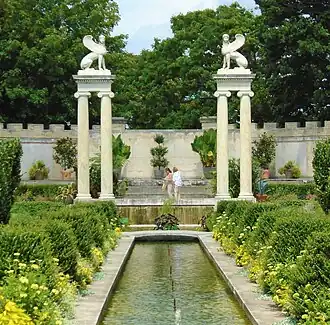 The Walled Garden – which is surrounded by crenellated walls with octagonal towers – is based on the Indo-Persian gardens of antiquity, called Paradise gardens or charbaghs. Like those ancient gardens, it is divided into quadrilateral sections by waterways, a concept based on the four gardens of Paradise or Eden mentioned in the Qur'an and the Bible. In the Bible, the four rivers of Eden were the Pison, the Gihon, the Tigris and the Euphrates, while the two trees were the Tree of Life and the Tree of Knowledge of Good and Evil. In Islamic scripture, Paradise (jannah) had four rivers: water, milk, honey and wine, and the Tree of Life.[27] The four waterways of the Untermyer gardens are – clockwise from the garden's entrance – the South, West, North and East Canals, which meet in a pool at the center.[26]