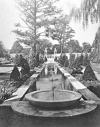 Untermyer had a passion for horticulture, which he said he inherited from his mother,[9] and was an expert in the subject. According to his family, if he could have lived his life over again, he would have wanted to be the New York City Parks Commissioner.[8] Untermyer wanted his estate to have formal gardens, and his competitive nature wanted them to be better than John D. Rockefeller's,[2][10] whose estate Kykuit was not too far away, so in 1916, after buying additional property to the north and east of the original estate to expand it to 150 acres (61 ha),[11] Untermyer hired the École des Beaux Arts-trained architect and landscape designer William Welles Bosworth – who had contributed to the architecture of Kykuit on and off for 20 years[12] – to build "the finest garden in America."[4][13]