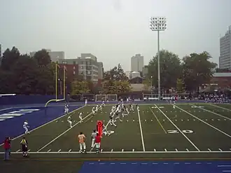 While the university's official mascot for its sports teams are nicknamed the Varsity Blues, its mascot, "True Blue," is a reference to the blue colour identity of the university.[6] Although the university prioritises the "blue" nickname in its identity, its mascot is a beaver, similar to the Crimson nickname of Harvard University, with the beaver uniquely connecting to its status as one of Canada's national symbols[7] and its feature on the university coat of arms.[8]