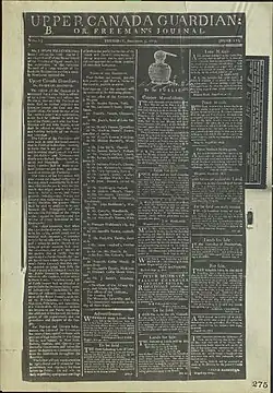 The Upper Canada Guardian; or Freeman's Journal was one of the first opposition papers in 19th century Upper Canada. Its publisher and editor Joseph Willcocks established it after moving to Niagara in 1807 to combat arbitrary power, oppressive land laws, and ultimately create liberty in the province.[1] Willcocks claimed that the Guardian was meant: “to disseminate the principles of political truth, check the progress of inordinate power, and keep alive the sacred flame of a just and rational liberty.”[1] In 1809, Judge William Dummer Powell complained of its widespread popularity and the fact that it was in nearly every household.[1] It was a four-page paper (11 by 17 and a half inches)[2] published between July 24, 1807, and June 9, 1812[1] and printed in with the roman cursive “f” representing the English long "s".[1] The Upper Canada Guardian came to an end when Willcocks sold its printing press to Richard Hatt in June 1812 for $1,600.[1]