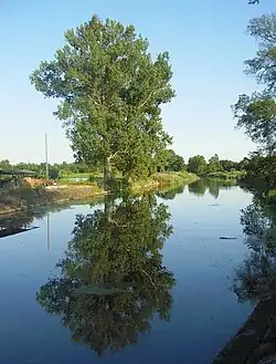 Facing the inactivity of the Prussian authorities, Count Fryderyk Skórzewski, owner of the nearby Lubostroń Palace funded the first regulation works on the Noteć river and the supply canal which flowed through his estate. As a result, in 1825, a narrow ditch bypassed the great bend of the Noteć, closed by two sluices,"Antoniewo" and "Frydrychowo":[3] it was called the "Kanał Łabiszyński" ("Łabiszyn Canal"). In 1860, two companies were established to tackle the issue of water flow in the upper and middle sections of the Noteć river: "Spółka Okręgowa Melioracyjna Pakosko-Łabiszyńska" ("Pakosko-Łabiszyńska Regional Melioration Company) and "Spółka Okręgowa Melioracyjna Bydgosko-Łabiszyszyńska".[4] In the 1860s and 1870s, the Noteć riverbed was straighten up at the level of Łabiszyn and the upper valley of the river, once considered as very marshy, was gradually drained: peat and swamps eventually gave way to meadows and pastures.