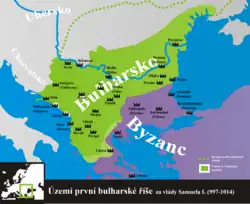 After the death of John Tzimiskes in 976, the Cometopuli launched a joint offensive into Byzantine territory. The former Bulgarian heartland to the northeast rose up in revolt and overthrew the Byzantine administration.[1][2] The uprising was led by the local nobles Peter and Boyan,[3][4] who became allies of the Cometopuli and submitted to their rule.[5] The newly liberated territories remained in Bulgarian hands until 1001.