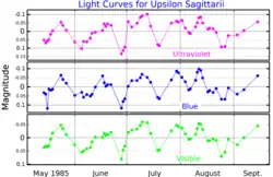 - ^ a b Malcolm, G. J.; Bell, S. A. (1986). "Evidence for pulsation in the hydrogen-deficient binary Upsilon Sagittarii". Monthly Notices of the Royal Astronomical Society. 222 (3): 543. Bibcode:1986MNRAS.222..543M. doi:10.1093/mnras/222.3.543.