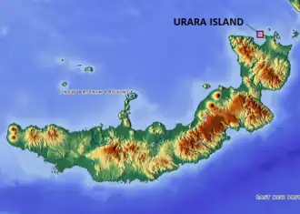 Urara Island is a small inhabited island in the northern part of Ataliklikun Bay (Bismarck Sea) in Papua New Guinea, located just off the mainland of the northern coast of New Britain. There are 3 villages, the largest lying on the southern central part of the coastline. Urara Island lies about 3 miles westward of Cape Liguan, and stands on a reef which extends a short distance only eastward of it and 1.5 miles to the westward.[1] Materbert Island lies about 6 miles west of the island and Watom Island lies to the north-east.[2]