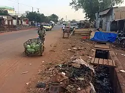 Urban runoff is surface runoff of rainwater, landscape irrigation, and car washing[1] created by urbanization. Impervious surfaces (roads, parking lots and sidewalks) are constructed during land development. During rain, storms, and other precipitation events, these surfaces (built from materials such as asphalt and concrete), along with rooftops, carry polluted stormwater to storm drains, instead of allowing the water to percolate through soil.[2]