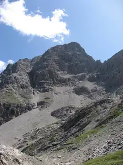 The Urbeleskarspitze is a 2,632-metre-high mountain peak in the Allgäu Alps. It lies within Austria in the state of Tyrol and is the fifth-highest summit in the Allgäu Alps and the second-highest peak in the Hornbach chain. Its neighbours in the Hornbach chain are the Bretterspitze to the southwest and the Zwölfer Spitze to the northeast.