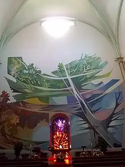 - Mosaic of the High Altar (inaugurated in 1996): this work is intended to cover the big wall that closes the central nave and that serves as background to the high altar and is a work of the lay missionary Peli Romarategui that was designed by the priest José María Muñoz.[11][10] It occupies 170 m2 and has more than 850,000 pieces that were made in the sanctuary itself. Its construction took more than two years.[12][13] It represents an allegory of the cross turned into a tree that goes through the four seasons of the year. It is the course of man through his four times and the flowering of life represented by the Resurrected Jesus.