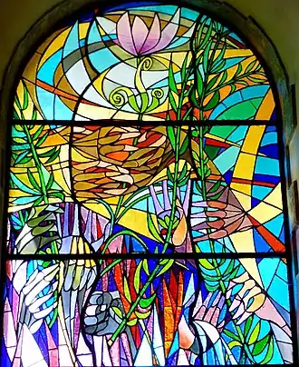- Next to the sacristy and the chapel, as well as above the choir, there are sets of stained glass windows depicting the natural vegetation of the surroundings. They show different species of trees and plants.