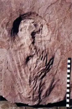 In 2004, a paper by paleontologist Marcelo Adorna Fernandes brought a study of trace fossils that had been preserved in three aeolian flagstones.[1] These trace fossils show a pattern that could be formed by an abundant falling stream of fluid and that is different from the structures described before in other occurrences in the paleontological record. The aspect of these urolites is very similar to soil deformation caused by modern ostrich urination, and certain groups of dinosaurs could have a similar urinary physiology. These urolites are the first evidence of liquid waste attributed to dinosaurs.
