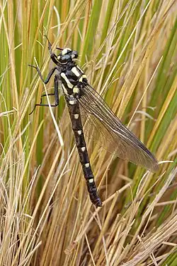 The second-largest New Zealand dragonfly species, Uropetala chiltoni has a body length of about 80 mm and wingspan of about 100 mm.[2] Uropetala chiltoni can be distinguished from the similar Uropetala carovei by large pale blotches on its labrum (which in Uropetala carovei is all black), and its black femur leg segments (which are brownish in Uropetala carovei).[2] It was described as a separate species in 1921, based on specimens collected at Cass and Arthur's Pass.[2]