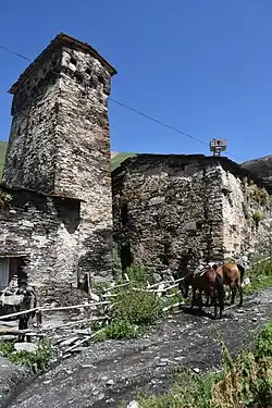 The most notable feature of the villages in Ushguli are the defensive tower houses found throughout the community. These houses, between 3-5 stories tall, were built primarily between the 9th and 12th centuries.[7][8] Although many of the towers in the lower towns such as Mestia have fallen into disrepair, the isolation of Ushguli has preserved the towers. Chazhashi, one of the villages within the community, contains over 200 of these towers and has been preserved as a Museum-Reserve.[8]