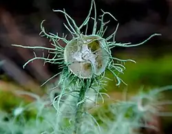 Usnea intermedia, the western bushy beard, is a grayish-yellowish pale green, irregularly much-branching, stiff shrubby fruticose lichen commonly anchored on holdfasts on trees, often on oaks.[1]: 201 Abundant apothecia are convex discs with a ring or thallus-like margin having tendril-like fringe radiating from it.[1]: 201 It was formerly called U. arizonica in North America.[1]: 201