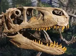 Additional paleofauna was recovered, most of it being unnamed and/or indeterminate, including an isolated mesoeucrocodylian skull that measures 20 cm (7.9 in) in length.[31] A neochoristodere unearthed from the Upper Yellow Cat Member, represented by a partial left femur,[35] shows that aquatic paleofauna was present and diverse during the Early Cretaceous of the Cedar Mountain Formation.[31] A large sail-backed iguanodont represented by large vertebrae and fragmentary remains,[36] an indeterminate eudromaeosaur known from a caudal vertebra and fragmented tail (UMNH VP 20209) were also present,[37] and at least one allosauroid known from teeth, which would’ve shared the niche of apex predator with Utahraptor. In areas they overlapped, the allosauroid theropod was likely more dominant, with their relationship possibly being analogous to bears and wolves in modern ecosystems.[38]
