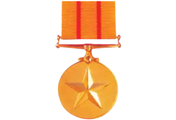 The medal is circular in shape, 35mm in diameter and fitted to a plain horizontal bar with standard fittings. The medal is of gold gilt. The medal has on its obverse the State emblem and the inscriptions in Hindi and English. On its reverse, it has a five pointed star. The riband is Gold in colour with two red vertical stripes dividing it into three equal parts.