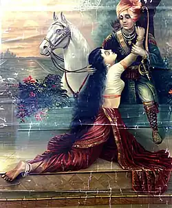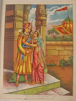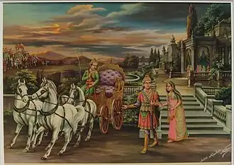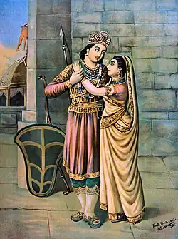 Uttarā is introduced into the main narrative in the Virata Parva, the fourth book of the epic, which narrates about the last year of the exile of the five Pandava brothers and their common wife Draupadi, which they had to spend in anonymity. They stayed together in the Matsya and took various disguises in the court of Virata. The third Pandava Arjuna lived as a eunuch named Brihannala, and was appointed as the tutor of Uttarā, teaching her the skills of dance, instrumental and vocal music that he had learned from the apsaras in heaven. Uttarā is praised by Arjuna for being exceptionally talented. After the end of their exile, the Pandavas revealed their real identities to Virata. Virata immediately offered Uttarā's hand in marriage to Arjuna, but he refused, reasoning that the relation a teacher has with a student is like that of a parent to a child. Instead, Arjuna suggested that Uttarā become his daughter-in-law by marrying his son Abhimanyu. With approval from both sides, the marriage ceremony of Uttarā and Abhimanyu was held in the city of Upaplavya in presence of their relatives and allies.[1][8] While residing in Upaplavya, the Pandavas were approached by a poor brahmin who, upon seeing Uttarā, prophesied that she would give birth to a son when the Kuru dynasty ends and for that reason he would be called Parikshit (lit. 'One who has been tested')."[9]