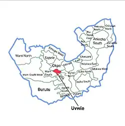 Uvwie (/hu-we-ɛ/), is a principal urban Local government area in Delta State. It lies along the Warri River and it is one of the 24 Urhobo kingdoms. The entirety of the LGA is conurbated with the city of Warri, making it a greater part of Warri metropolitan area[3]