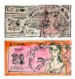 In the middle 1990s, in his two-dimensional works on varied themes, Vũ employed unusual forms of support - newspapers, journal pages, and calendars, often incorporating his own textual statements. One of the largest series, Money, was created from the early-1990s into the 2000s referring to the concepts of state, nation, economy, trade, borders, and desire for borderless freedom. Most of the works from this series include textual insertions in the form of known slogans and quotations, which demonstrate artist’s eccentric humor, such as “Napoleon ou rien” (“Napoleon or nothing”), “Millionario o Muerte” (“Millionaires or Death”, a transformation from “Patria o muetre!”) or his social concern as in “Quo vadis?” and “L’homme sans pays” (“A man without a country”). The last ones frequently appear alongside a picture of the artist as a pilgrim. The idea of pilgrimage is linked to both artist’s real life and fictitious journeys, “as well as to dreams of liberating from geographical, racial, national or political constraints”.[15] Most of the euro money bills are united by Tân’s favorite quotation from Dostoevsky: “Beauty will save the world”, undermining power of the real money in commercialized society.[16] Over the decade the series evolved when after 1996 the artist developed dollar-scaled, duplicated and hand-coloured currency notes (dollars, euros, etc.), The substitution of official figures representing state power by personas belonging to the global cultural pantheon on the artist’s banknotes “indirectly subverts the nation’s monolithic discourse of history and authority.”[17] Moreover, with its potential for circulation “Intellectually elegant, medium-savvy, aesthetically accessible, and subtly critical, Vu Dan Tan’s money series embodies Southeast Asia contemporary practice at its most accomplished”.[18]