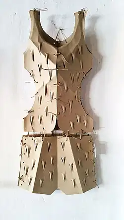 Series Fashion, which arose at the turn of the millennium and developed until the artist’s death, represents human-scale costumes-like objects-sculptures “made out of recuperated cardboard and carefully folded, cut, manipulated, perforated, painted” to reference women.[22] Along with explorations of the complicated woman-icon, the works embody various tensions: strength and domination, presence and absence, public and private.[23]