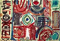 Drawing and painting develop periodically from the middle 1970s till the end of the artist’s life. The diverse figurative and abstract paintings of the 1980s give way to the voluminous Festival banners series (1989-1994) sporadically produced during six years these gouaches on traditional dó paper and newspapers introduce an unknown but inclusive iconographic language which comprises images resembling Chinese characters, patterns of minority’s textiles, Christian motifs and shamanistic masks and banners. These emblems reference to village life and social practices that may contradict still-prevailing political edicts.[13]