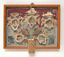 Vũ's so-called masks, produced over decades, made from woven flat baskets, dried fruit shells, and bamboo trunk pieces, were recognised for their originality in the late-1990s.[10] The Basket Masks series, borrowing familiar iconographic elements “transforms and reinterprets these to propose new, open narratives unknown in traditional culture”, writes art historian Iola Lenzi, who additionally sees in them a performative ethos.[11] She also traces Vũ Dân Tân’s 1990s breakthroughs to the “conceptual evolution started with his basket series of the late 1970s”.[12] These masks, although not performed, suggest Vietnam’s traditional theatre and performativity, moreover, “In their intertwining of the visual and potential for improvised viewer response, Basket Masks harbor characteristics of installation, unknown in Vietnam in the 1970s.”[11]