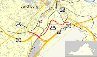 State Route 128 (SR 128) is a primary state highway in the U.S. state of Virginia. Known for most of its length as Mayflower Drive, the state highway runs 3.47 miles (5.58 km) from SR 163 north to U.S. Route 460 Business (US 460 Business) and US 501 Business within the independent city of Lynchburg.