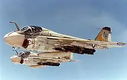 In 1992, NF-515, an A-6E SWIP Intruder led to VA-115 becoming the first A-6 squadron to fire the AGM-65 Maverick at an Open Ocean target, with the Maverick being one of the new weapons the SWIP Intruder could carry.[5] That same year, deployed to the Persian Gulf in support of Operation Southern Watch enforcing United Nations resolutions against Iraq. The squadron was awarded the Meritorious Unit Commendation for their performance flying 115 combat missions over Iraq. In 1993, VA-115 deployed to the Persian Gulf in support of Operation Southern Watch, and in 1994 they received four aircraft with night vision device capability. In 1996, VA-115 supported contingency operations in the vicinity of Taiwan.