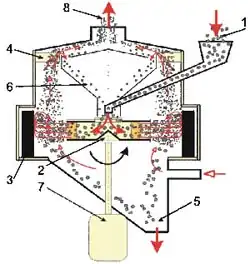 A schematic drawing of a VSI mill is shown at Fig. 1. Raw material particles transports via hopper (1) into the accelerator (2). An accelerator (2) rotates with a high speed and particles increase their speed by a centrifugal force. After leaving channels of the accelerator particles impact with a wear plate (3) in the grinding chamber. A high speed impact leads to destruction of particles into pieces of different size. Big particles (greater than 1 mm) fall down to outlet (5) and later they transport to hopper by an elevator. Other particles (less than 1 mm) lift by air stream into a classifier where blades (4) make rotating dust flow. Middle size particles shift to wall by centrifugal force in a big chamber of a classifier and fall down to cone (6) and later they move into an accelerator (2). Small particles move by air stream to outlet (8). Fine tune of a product size is achieved by changing of blade angle.