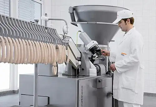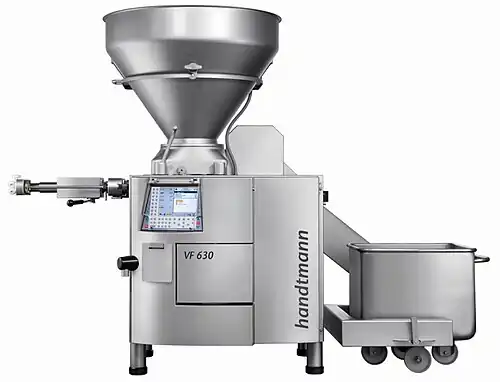 In the food sector, moving or transporting fluids is achieved with the aid of pump technology. Colloquially, this is known as filling or portioning. Various different types of pumps are used, depending on the type of filling products to be moved. Vacuum fillers with vane cell feed systems and vacuum feeding are commonly used for viscous products. The products are transported with the aid of a hopper with a feeding device, a vane cell feed system under a vacuum and appropriate volume expulsion in the pump housing. This is basically a volumetric feed principle, which means that a certain weight is defined via a volume. In addition to the vane cell feed systems,[2] also known as rotary vane pumps, there are also screw feed systems with feed augers, toothed wheel feed systems and evacuated lifting cylinders. With all these systems, transportation is achieved via volume expulsion under a vacuum. Vacuum fillers are traditionally used in the meat processing industry as well as in other food sectors. They can also be found in some non-food sectors. Generally speaking, vacuum fillers can be used for filling pasty and compressible products.