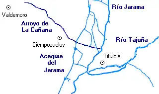 The La Cañada stream originates in the municipal district, and then feeds into the Jarama River. The Jarama runs parallel to Valdemoro and never enters its limits.