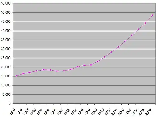 Foreign immigration has increased significantly in recent years, going from 20.61 people per 1000 inhabitants in 1998 to 110.87 people per 1000 inhabitants in 2006. These immigrants are primarily from Latin America and non-EU Europe.[9]