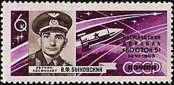 He launched on the Vostok 5 mission from Baikonur Cosmodrome in Kazakhstan on 14 June 1963.[5] During the flight he conducted experiments, such as photographing the Earth's horizon and documenting the growth of peas. He also floated about in the cabin and adjusted the spacecraft orientation numerous times.[5] Two days into his flight, Valentina Tereshkova flew the Vostok 6 spacecraft within five kilometres of Bykovsky's.[6] Bykovsky set a space endurance record of five days in orbit[7] where his call-sign was "Hawk" (Russian: Ястреб).[8] Although this duration has been surpassed by multi-crew flights, it remains the record for a solo spaceflight.[9] He also performed the first human bowel movement in space, at 9 hours and 5 minutes into the mission.[10]