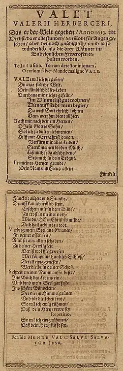 The hymn's first word, "Valet", is derived from the Latin valete (fare thee well) in the original imprint: Herberger arranged his own Christian name "Valerius" as an acrostic —the first letters of each of the five stanzas form his name, Vale R I V S.[ 3] The hymn text was first printed in Leipzig in 1614.[ 4]