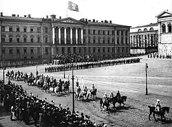 The Valkoisten Voitonparaati (transl. White Victory Parade; Finnish: Valkoisten voitonparaati pronounced [ˈʋɑlko̞i̯s̠t̪e̞n ˈʋo̞i̯t̪o̞mˌpɑrɑːt̪i]) was a military parade of the Finnish White Guard on 16 May 1918 celebrating their decisive victory in the Finnish Civil War, which officially ended the day before.[1][2] The parade took place in Helsinki, the capital of Finland. The parade was presided by General Carl Gustaf Emil Mannerheim, the then Commander-in-Chief of the Finnish Defense Forces, a position he would resign from 14 days later.[3][4] It consisted of 12,000 men marching down the streets of the capital.[5] It is regarded today as a political show of force organized by Mannerheim to strengthen his position vis-à-vis the German troops in the country. The parade played an important role in Mannerheim's later career, as a result of which he became nationally known to the point of becoming the 6th President of Finland in the mid-1940s.[6] The Whites also organized victory parades in other cities they had occupied during the war. Large parades were also held in Vaasa and Vyborg, both of which Mannerheim attended.[7]