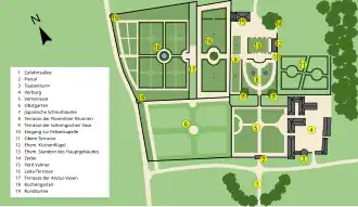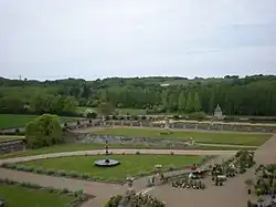The park and garden belonging to the château are completely enclosed by a wall with two round towers on the northwest side. An approximately 450 metres (1,480 ft)-long[17] avenue planted with horse chestnuts leads from the southwest to the château and opens in a semicircle in front of a large rusticated portal with a lattice gate and a broken triangular gable. Behind it begins the terraced garden, which was laid out along two axes in the 17th century. The first runs as an extension of the avenue from southwest to northeast; after the entrance gate it crosses the front terrace flanked by three outbuildings (Terrasse des devants), crosses the almost 15 metres (49 ft)[6] wide dry moat by means of a three-arched stone bridge, to finally end after the Florentine fountains terrace (Terrasse des fontaines florentines) and the former château site in the forest park. The second axis begins in the southeast and ends in the northwest. It overcomes eight different height levels and a height difference of 30 metres (98 ft).[18] It starts on an embankment with yew trees and hibiscus bushes and continues across the Upper Terrace (Haute terrasse) and the Florentine Fountains Terrace, crosses the Terrace of the Lorraine Vase (Terrasse du vase de Lorrain) and the Leda Terrace (Terrasse de Leda) to reach, via a staircase, the Terrace of the Anduz Vases (Terrasse des vases dʼAnduz) and finally, after crossing the kitchen garden, ends on the other side of a street at the "Grand Canal", which is fed by the Brenne.