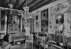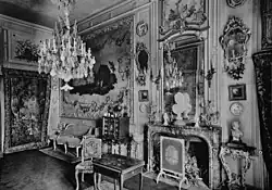 On the ground floor of the main building, in addition to two living rooms, a staircase, an office and a large kitchen, there was a room called Grand Salon whose central ceiling painting was attributed to the painter François Lemoyne.[13][14] It was surrounded by corner medallions in the grisaille technique. The library had a painted wooden beam ceiling and a fireplace that showed a portrait of the French King Henry IV. This fireplace was undamaged in the 1948 fire and Count Saint-Venant subsequently sold it; it was later installed in a château in Normandy.[15] Another remarkable fireplace stood in the dining room. It had been assembled from old stone fragments from the 15th and 16th centuries and installed there in the mid-19th century. Among the few pieces spared from the fire was a lintel made of tufa from the northeast facade of the main château. It shows a stag's head in full relief and is now attached to the fireplace in the orangery. On the first floor, there were six living rooms and some utility rooms, and in the attic, there were also various smaller rooms.