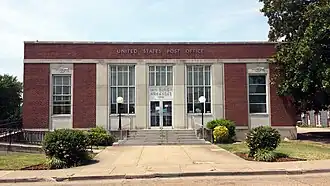 The Van Buren Post Office is located at 22 South 7th Street in Van Buren, Arkansas. It is a single-story brick and stone building, with restrained Art Deco styling. The main entrance is topped by a panel with aluminum signage identifying the building, with a large window above. It is flanked by tall pilasters, beyond which are tall windows and another pair of pilasters. The outer bays of the facade, set off from the center, have windows topped by decorative Art Deco panels. The post office was built in 1936, and features a mural by E. Martin Hennings (a member of the Taos Society of Artists), that was executed in 1940 with funding from the Treasury Department's Section of Fine Arts.[2]