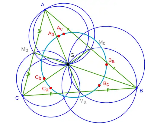 Specifically, let , , be the vertices of , and let be its centroid (the intersection of its three medians). Let , , and be the midpoints of the sidelines , , and , respectively. It turns out that the circumcenters of the six triangles , , , , , and lie on a common circle, which is the van Lamoen circle of .[2]