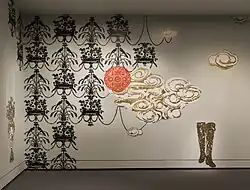 Taking Place is a 2,700 sq. ft. painting installation that reimagines some of the Peabody Essex Museum's most beloved objects from their global collections.[3] Platacis' research-based art practice resulted in 210 stencils, all drawn and cut by hand. Organic forms and curvilinear lines emerge as dominant elements across generations and cultures as her labor-intensive contemporary approach to painting connects to the skill and artistry embedded within the historic objects of PEM's collection. The exhibition opened September 2019 and all 210 stencils have been acquired by PEM for the museum's permanent collection.