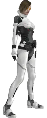 In terms of character design, Vanessa is a woman with short brown hair and orange sunglasses, wearing a skintight black and white bodysuit that wraps around her body and connects to her spine. The suit in turn has a protrusion jutting from the back near the collar, where it stores large amounts of energy that can be fired through her gloves.[7][9] A wide variety of different colored suits can also be unlocked during the course of gameplay, each having a unique "energy" attack.[10] One particular suit, Papillon, is a black suit that leaves large amounts of skin exposed, revealing a butterfly tattoo on her lower right abdomen.[11]
