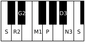 | Avarohanam | Ṡ N₃ D₃ P M₁ G₂ R₂ S |