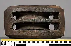 Blocks, or pulleys, are a means of redirecting the path of a rope or providing a mechanical advantage, either on its own or in combination with other blocks, to increase the force applied. The majority of blocks have a sheave which rotates on an axle – the rope that goes through the block fits into a groove cut in the sheave. The load in the rope is transferred from the axle to the shell of the block, which, at the time of Vasa, has a rope strop (usually) or wrought iron strap which goes around the shell and is used to fasten the block to another object. More rarely, a block does not have a sheave. It is then termed a "dead block".[58]